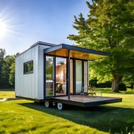 green tree modern design green grass minimalist architecture sunny environment modular home glass door outdoor deckSimilar Photos