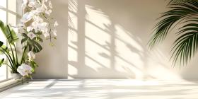Abstract studio background for product presentation room with shadows, flowers - Ai Generated