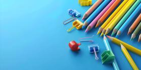 Colorful crayons, pencils and erasers on blue background with copy space - Ai Generated