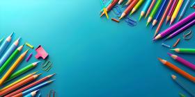 Colorful crayons, pencils and erasers on blue background with copy space - Ai Generated