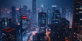 Modern city Skyscrapers at night with network connection concept - Ai Generated