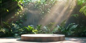 Podium for product stand with plant background and cinematic light, front view - Ai Generated
