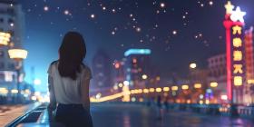 Young woman traveler is visiting at Avenue of Stars at night - Ai Generated