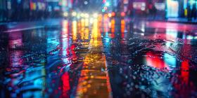 Colorful City Lights Reflecting on Wet Road Background: Rainy Urban Night, Rainy Night in the Big City - Ai Generated