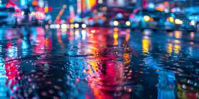 Colorful City Lights Reflecting on Wet Road Background: Rainy Urban Night, Rainy Night in the Big City - Ai Generated