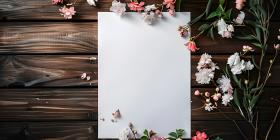 Blank paper with pink flowers on rustic wooden background - Ai generated