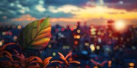 Autumn leaves on the background of the city at sunset, Autumn background - Ai generated