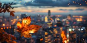 Autumn leaves on the background of the city at sunset, Autumn background - Ai generated