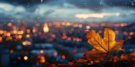 Autumn leaves on the background of the city at sunset, Autumn background - Ai generated