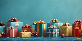 Top view of Christmas gift boxes and snowflakes on blue background - Ai Generated