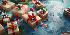 Top view of Christmas gift boxes and snowflakes on blue background - Ai Generated