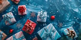 Top view of Christmas gift boxes and snowflakes on blue background - Ai Generated