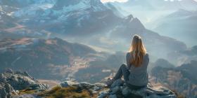 Woman sitting on top of the mountain and looking at the beautiful landscape - Ai Generated