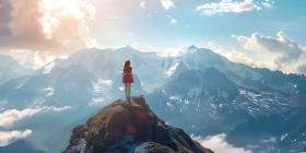 Woman sitting on top of the mountain and looking at the beautiful landscape - Ai Generated