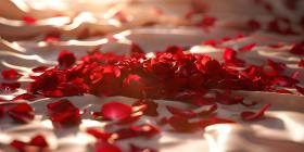 Red rose petals on bed in bedroom, Valentine's day concept - Ai Generated