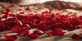 Red rose petals on bed in bedroom, Valentine's day concept - Ai Generated