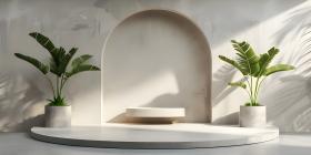 3d rendering of white podium for product presentation with palm leaf shadow on the wall - Ai Generated