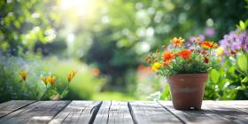 Flower pot on a wooden table in the garden, Selective focus - Ai Generated