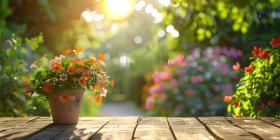 Flower pot on a wooden table in the garden, Selective focus - Ai Generated