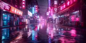 Night city street with neon lights reflected in the puddle - Ai Generated