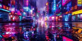 Night city street with neon lights reflected in the puddle - Ai Generated