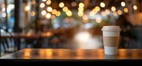 Coffee cup on wooden table in coffee shop with bokeh background - Ai Generated