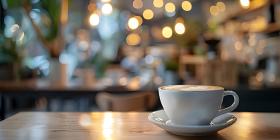 Coffee cup on wooden table in coffee shop with bokeh background - Ai Generated
