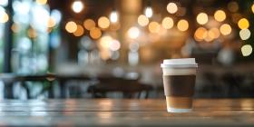 Coffee cup on wooden table in coffee shop with bokeh background - Ai Generated