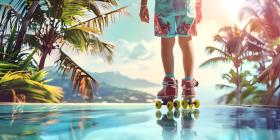 Close up of the legs of a girl on roller skates on the road at sunset. - Ai Generated