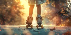 Close up of the legs of a girl on roller skates on the road at sunset. - Ai Generated