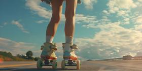 Close up of the legs of a girl on roller skates on the road at sunset. - Ai Generated