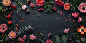 Flowers composition, Frame made of beautiful flowers on black background - Ai Generated