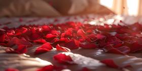 Red rose petals on bed in bedroom, Valentine's day concept - Ai Generated
