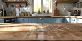 Empty wooden table and blurred kitchen interior background, product display montage - Ai Generated