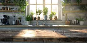 Empty wooden table and blurred kitchen interior background, product display montage - Ai Generated
