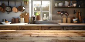 Empty wooden table and blurred kitchen interior background, product display montage - Ai Generated