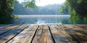 Wooden deck on the background of the lake in the forest - Ai Generated
