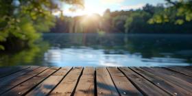 Wooden deck on the background of the lake in the forest - Ai Generated