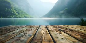 Wooden deck on the background of the lake in the forest - Ai Generated