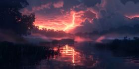 Fiery thunderstorm in the night sky over the forest, Storm on the sea, Stormy sky - Ai Generated
