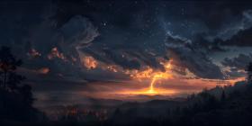 Fiery thunderstorm in the night sky over the forest, Storm on the sea, Stormy sky - Ai Generated