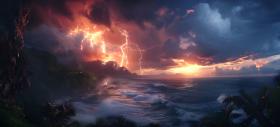 Fiery thunderstorm in the night sky over the forest, Storm on the sea, Stormy sky - Ai Generated