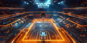 Basketball arena with glowing court and high-tech illuminated stands - Ai Generated