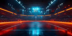 Basketball arena with glowing court and high-tech illuminated stands - Ai Generated