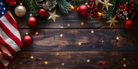 American flag with Christmas decoration on wooden table Top View - Ai Generated