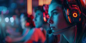 Team of focused esports gamers competes in a tournament while wearing headsets - Ai Generated