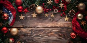 American flag with Christmas decoration on wooden table Top View - Ai Generated