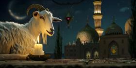 Sheep Grazing Near a Mosque Background, Mosque Scenery with Sheep in Foreground - Ai Generated