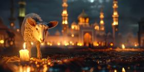 Sheep Grazing Near a Mosque Background, Mosque Scenery with Sheep in Foreground - Ai Generated