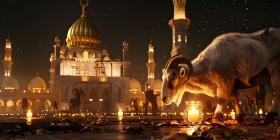 Sheep Grazing Near a Mosque Background, Mosque Scenery with Sheep in Foreground - Ai Generated